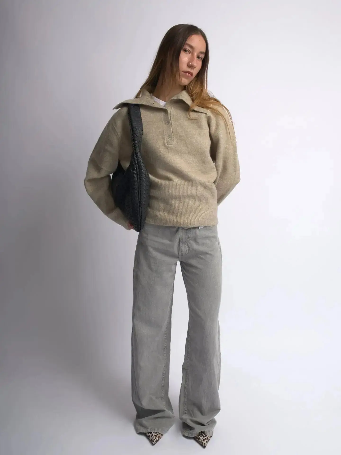 - Shoulder bag with a semi-circular shape and woven design